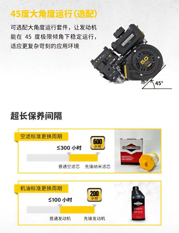 - 5) Extended maintenance intervals: ordinary air filters are replaced every <300 hours, dual nano filters can be replaced every 600 hours; ordinary engine oil is replaced every <100 hours, Vanguard engine oil can be replaced every 200 hours.